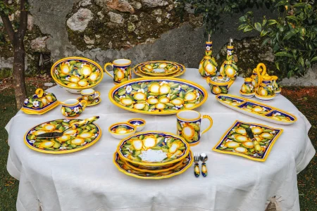 Our collections include fully handmade Italian ceramic pieces: tableware, decorative objects such as vases, amphorae, planters, wall plates, lava stone tables, bespoke projects, limited editions, and custom design creations.